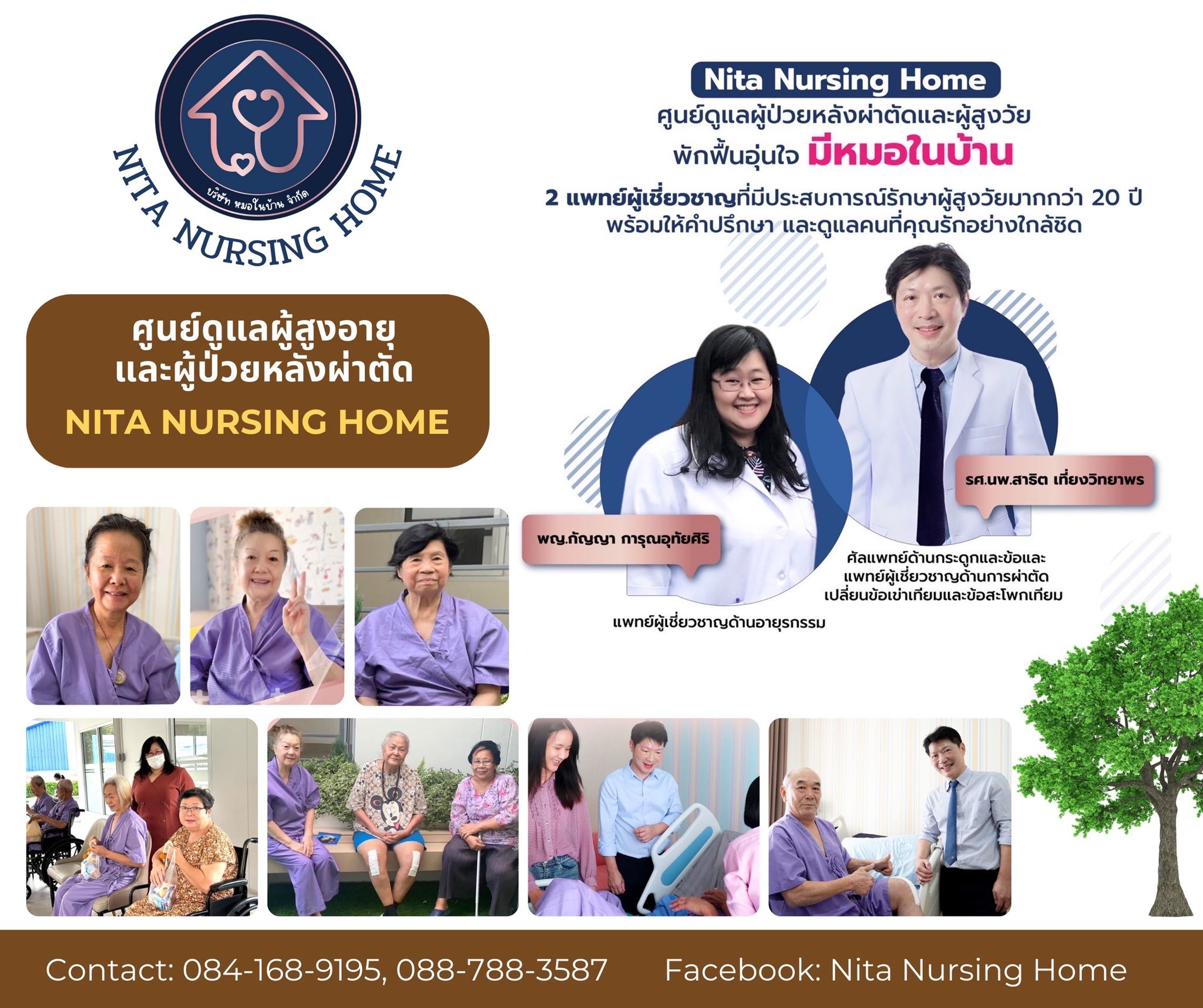 “นิตาเนอร์สซิ่งโฮม” (Nita Nursing Home) ศูนย์ดูแลผู้สูงอายุ ผู้ป่วยพักฟื้น รังสิต ธัญบุรี ปทุมธานี สำหรับผู้สูงอายุและผู้ป่วยพักฟื้นหลังผ่าตัดที่ก่อตั้งขึ้นจากความตั้งใจของแพทย์สองท่านซึ่งมีประสบการณ์ในการดูแลผู้สูงอายุมาตลอดชีวิต สำหรับความตั้งใจแรกคือจะสร้างบ้านหลังที่สองที่เหมาะสมในการดูแลพ่อแม่ของพวกเขาที่เข้าสู่ช่วงอายุที่มากขึ้น จนอยากแบ่งปัน “บ้าน” หลังนี้ไปสู่การดูแลพ่อแม่เพื่อนที่เริ่มเป็นผู้สูงวัย